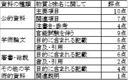 物質的根拠のある味の要件は、@味が下に付く用語である、A刺激物が単独の化学物質である、B化学物質と味の因果関係が明確である、およびC化学物質が呈する味名の信頼性が資料で確認できることとしている。Cについて、具体的には各資料に下表のような評点を設定し、判定基準値を評点の合計が10点以上としている。